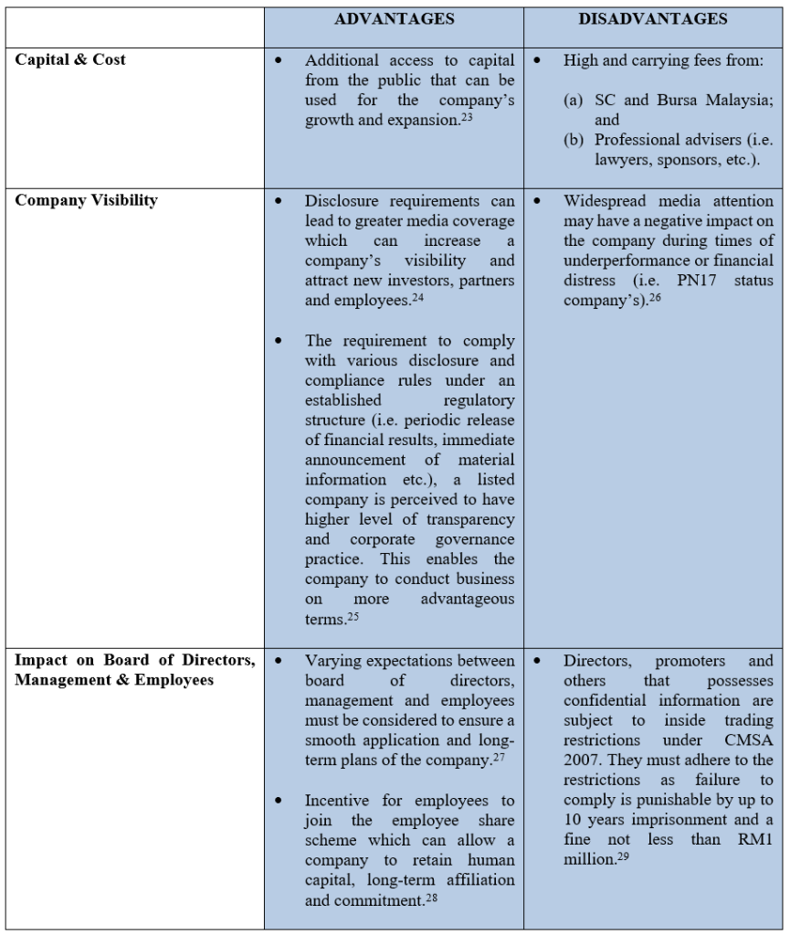 Proper planning must be undertaken before a company puts themself on the market. It is necessary to consider both the potential benefits and drawbacks from listing such as: